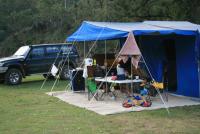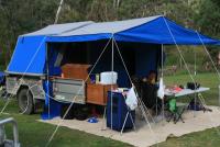 It's a 2007 bayside offroad CT with all the must have gear : kitchen , watertank , electrics etc, etc , I got it second hand for a price that was basically a steal as the guy that had used it twice to try and get his wife to go camping but she is a hotel lady and there was no way she was roughing so the camper had to go , even though it had heaps of gear on it I had to modify it to suit what i wanted , here's some pic's of it : the kitchen and storage box Added a new/bigger toolbox to the front : Moved the spare to the tailgate : Here's a couple of pics of our set-up at 1770 campgrounds : Landcruiser park :