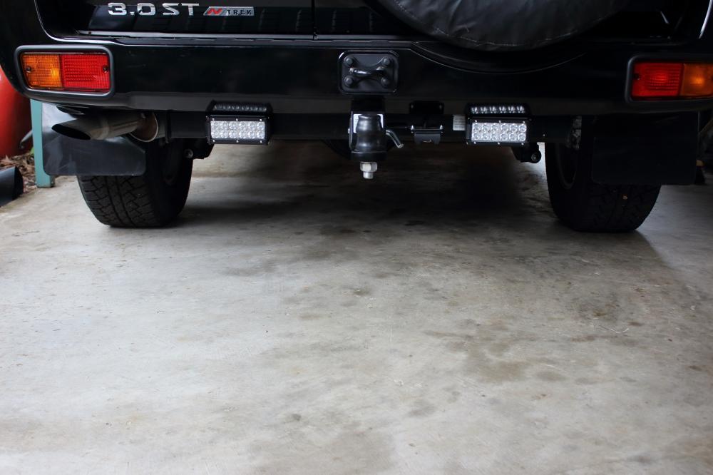 Finished installing x2 camping lights/ reversing lights which runs threw a rely & switch. Made a bracket with a 25mm off set to raise the lights to nearly above rear toe -bar out of 40mm x 3mm aluminium about 400mm long. Screwed it up across x2 rear bumper bar screws, solid as. They shouldn't get hit on departure angle. Got some pic for you to, thanks to all that help me out in this installation to. cheers paul