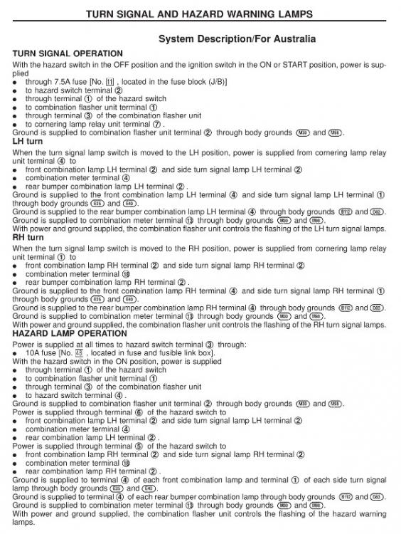 Hello, There are 4 different version of indicator/flasher circuits depending where you live (typical Nissan). I reckon you have earth/ground issue. Bellow is the description for Australia :