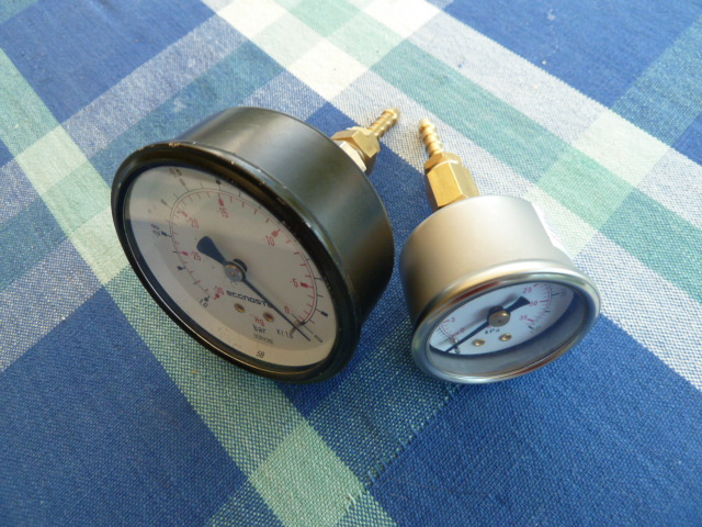 Being someone who has never subscribed to the "if it ain't broke don't fix it" way of thinking, I am constantly looking for little ways to improve things (actually that is my job only I do it with Filling and Packaging machinery). You will often hear people come back to a poster saying check your gauges they must be out and in the case of clutch and brake, what vacuum do you have? Well I have a simple temporary solution which doesn't require drilling holes in a perfectly good vehicle and / or permanently adding more gauges on or around the dash. I installed a small 1/8th BSP stainless steel 3 way ball valve under the bonnet to which Vacuum and Boost are connected. When I installed my needle valve I run an extra line into the cab which terminates just underneath my homemade pillar pod this serves as the common exit of the 3 way. I have very simple 1/8th BSP vacuum and 0-30 pressure gauges setup on 4mm 1/8th BSP barb fittings which can be pushed into the line and hung on the dash for occasional testing purposes, nothing fancy no lights bells or whistles. I find it quite handy and I can switch between sides of the IC easily to mix and match the info I'm after. I also use the same pressure gauge to check fuel flow post fuel filter, but not via the 3 way. I am currently looking for a simple, value, compound gauge to further simplify the matter. Below: 3 way valve mounted on the same bracket I fabricated for the relocation of the vac surge tank during my Cross Country IC install, you may not have the tank but the mounting position is still there. If you are still running the engine cover you will need to mount somewhere else for access. The spare line termination can be seen to the right and b elow the EGT gauge. The 2 gauges I use, soon to be replaced by a small simple compound gauge.