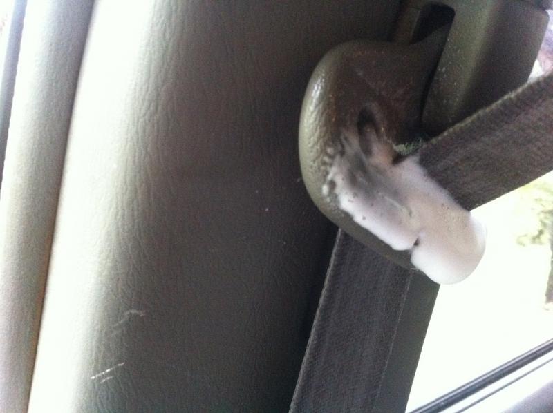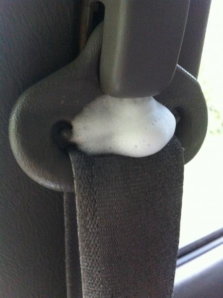 Allow a Minuit to soak, then use old toothbrush or the like to get Gunk out. Hold seatbelt out of the way conveniently as in above photo like this.