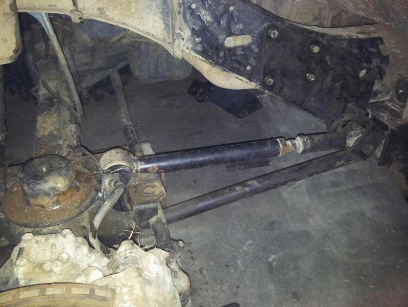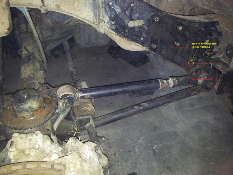 June 25, 201213 yr Author comment_5137 Well its been awhile, my rig been sitting with a dead alt and a flat tyre so i started ripping the alt out replaced the coil, points, give it an extended rotor button and new cap. Also decided to flush the old coolent out and give the power steering a service and new oil, while i am waiting for the new alt i decided to put it in the shed and started ripping the radius arms out to fit a wizard 5link into the front. Got started on this today at 1pm and geez not overly impressed with the setup so far, the drop boxes for the lower arm needed some major grinding to get it to sit right and to get the cross member bolt holes to line up then the bracket on the chassis for the upper arm is all wrong it should have been made so the chassis mount for the upper arm was higher and more forward then the lower and it flex's really bad off the chassis so im going to have to add a few extra bolts and later on ill make a new bracket for the uppers to relocate them properly. So basically 6 hours later i had one side mounted up now tomorrow i just need to go get some new bolts and get stuck into the drivers side and it will be all bolted up and finished by wednesday arvo ready and waiting for my alt to arrive so i can go give it a test. this picture shows where i need to add bolts now to stop it flexing and where i want to move that mount later in the year. Report